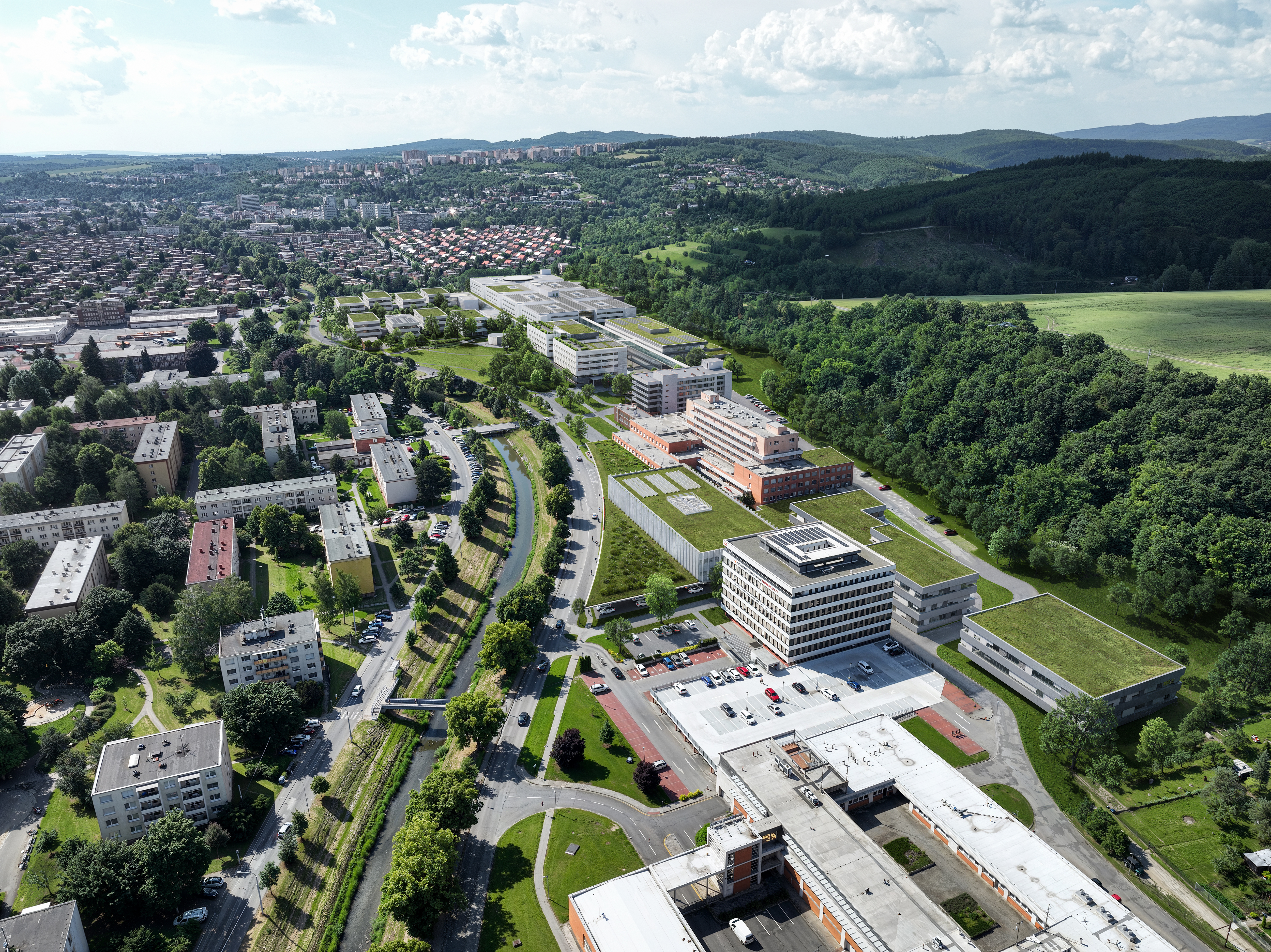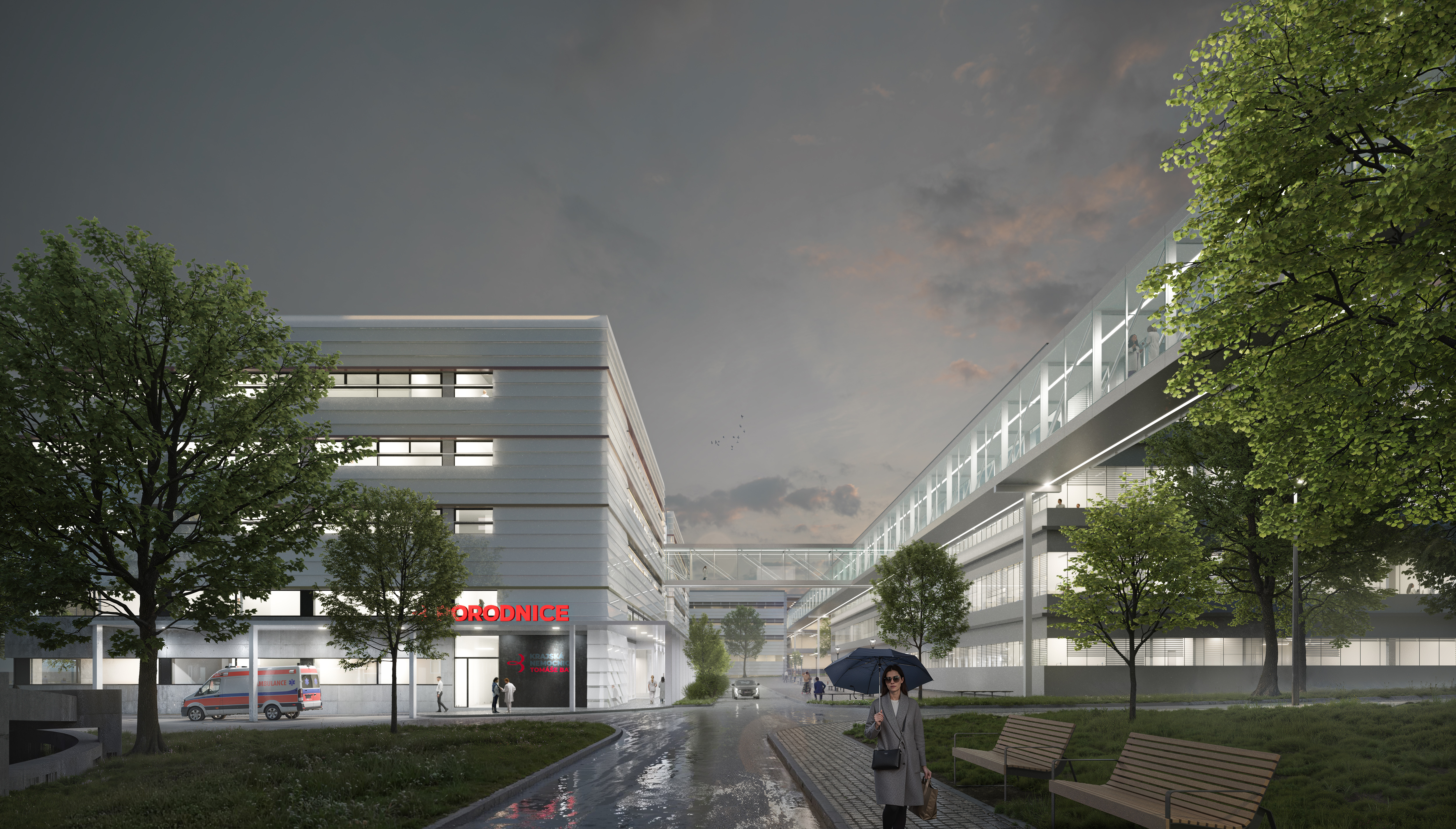 Součástí návrhu jsou zelené plochy a parková úprava areálu, které dotvářejí princip „nemocnice v zeleni“. Projekt spojuje funkčnost s respektem k urbanistické tradici Zlína a vytváří moderní prostředí pro pacienty i personál.